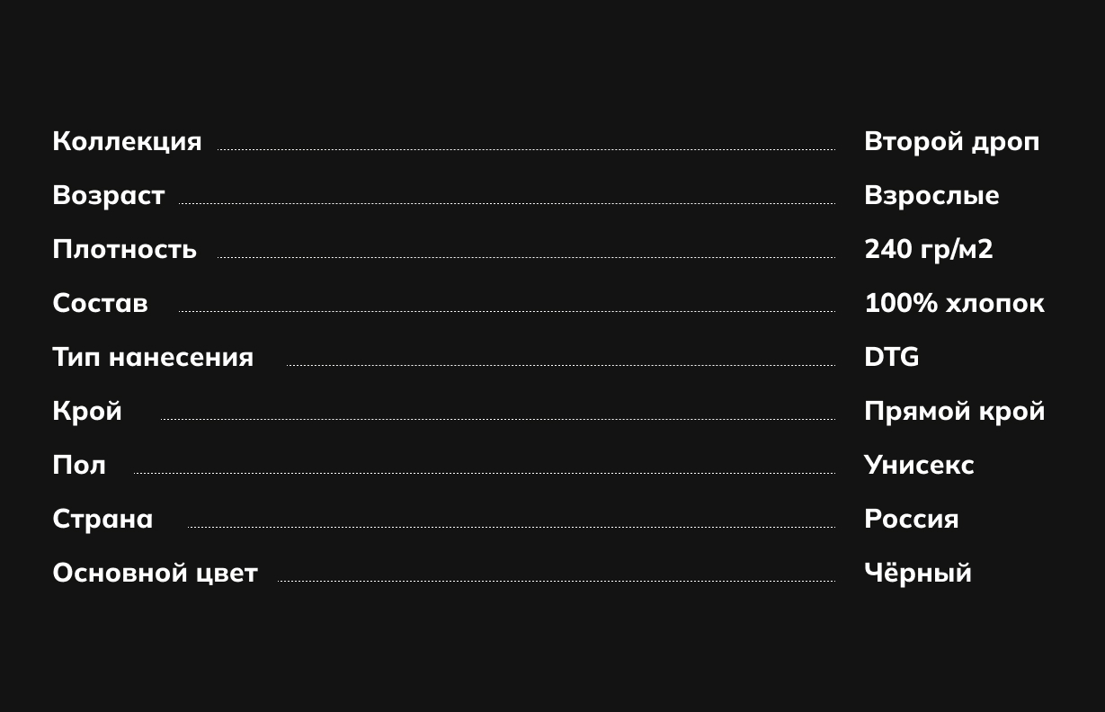 Плотный хлопок 240 г/м², прямой силуэт, аккуратная посадка. Эта модель — второй шаг айти-дропа, где каждая новая версия раскрывает новый уровень деталей и смыслов.